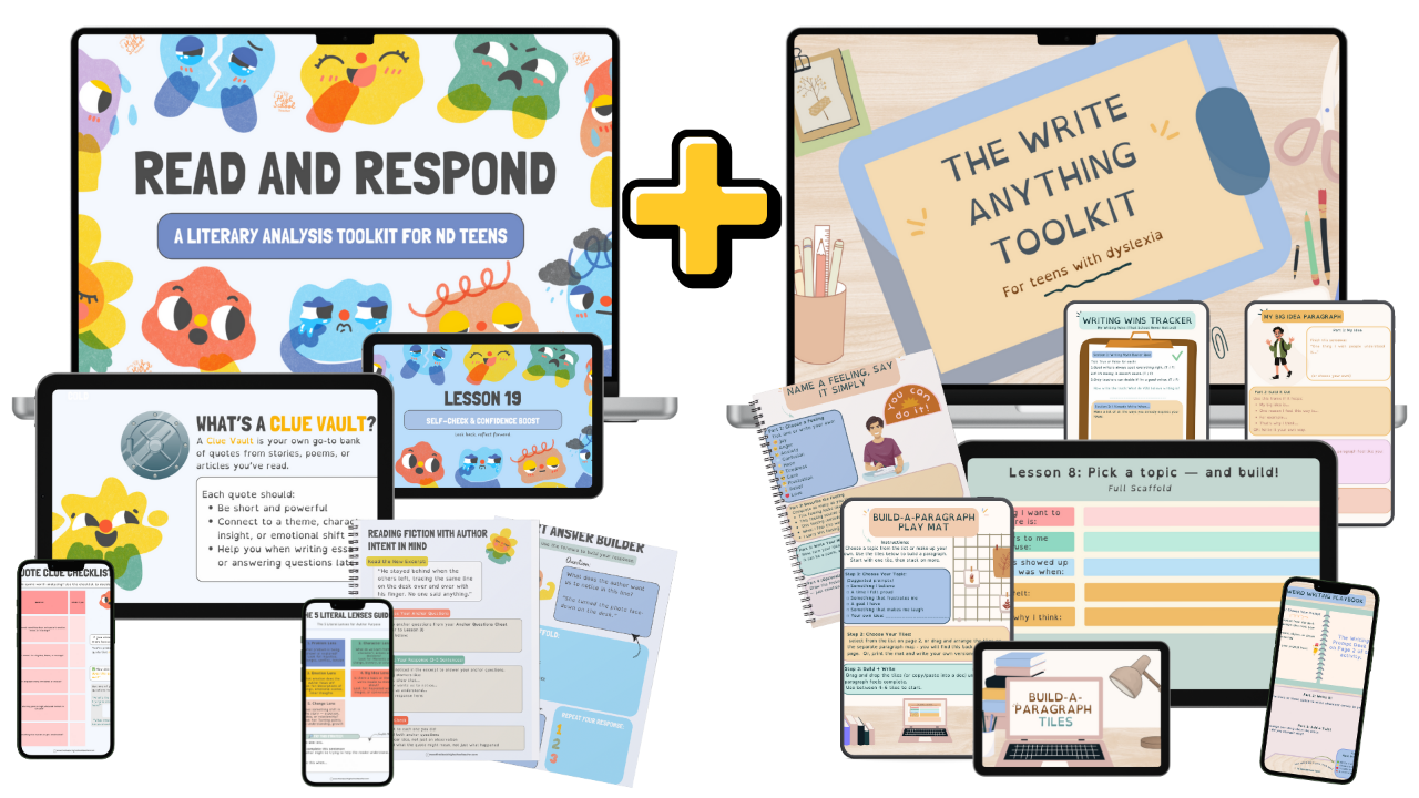 Teaching neurodivergent teens how to understand and analyze texts in English classāusing methods that match how they think. Does your teen freeze up when asked what a quote means?You're not alone. For neurodivergent teens, tasks like āfind the themeā or āexplain the authorās intentā can feel vague, frustrating, and downright impossible. Thatās why we created Read and Respondāthe only literary analysis toolkit designed for how ND teens actually think, process, and learn. With brain-friendly visuals, step-by-step templates, and scaffolded practice texts, your teen will go from blank stares to lightbulb momentsāwithout the meltdowns or guesswork.