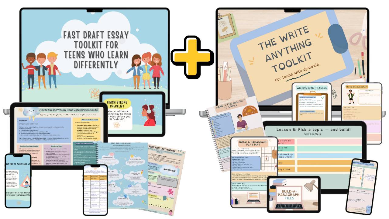 The Write Anything Toolkit is a flexible, confidence-building writing program for teens with dyslexia, ADHD, or learning anxiety. Itās designed for kids who have so much to say but struggle to get it down. Through visual sentence builders, flexible prompts, and emotional support, it helps teens write in a way that works for their braināwithout stress, shame, or red-pen pressure.