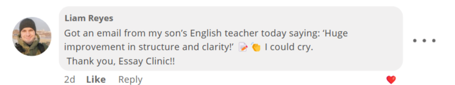 "Before the Essay Clinic, my daughter struggled to organise her thoughts. Now, she's not only confident in her writing, but also consistently scoring higher on her essays!" - Jane. M, Parent